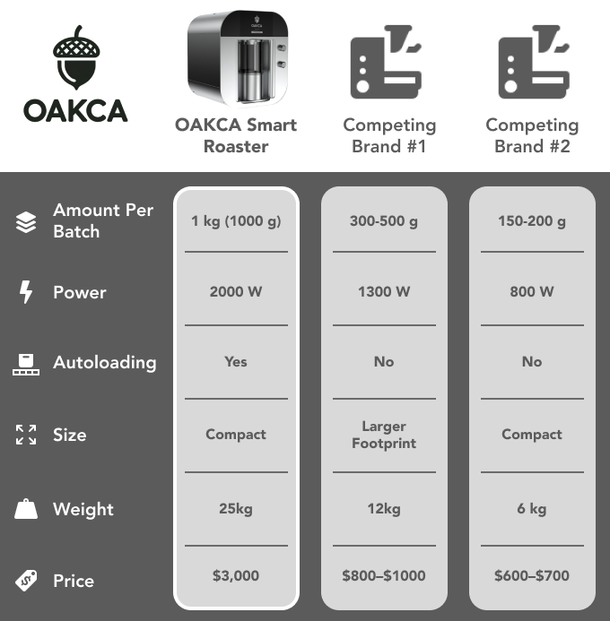 Dive into the technical details that make the OAKCA Smart Roaster stand out. Learn how it outperforms competing brands with superior capacity, power, and innovative features that redefine coffee roasting for enthusiasts and professionals alike.