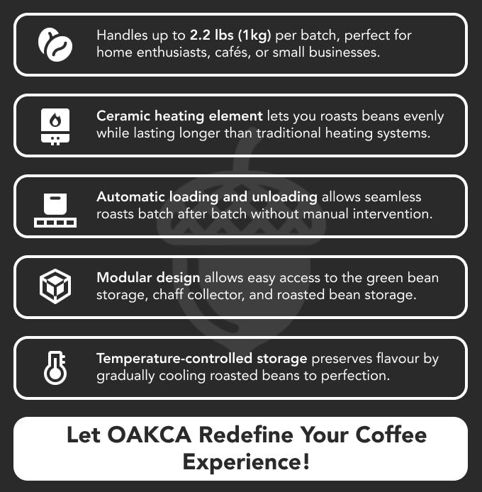 Discover the features that elevate your coffee journey. From seamless automatic loading and unloading to temperature-controlled storage and a modular design, every detail of the OAKCA Smart Roaster is crafted for precision, convenience, and unparalleled flavor.