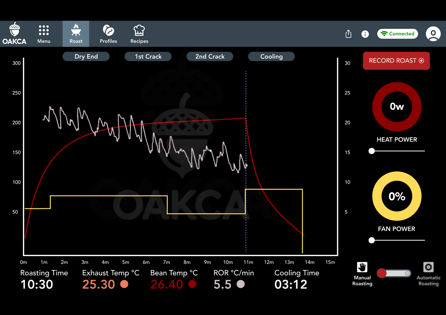 The sophisticated control interface of the OAKCA roaster is designed to be intuitive, straightforward, and seamlessly compatible with Artisan software.